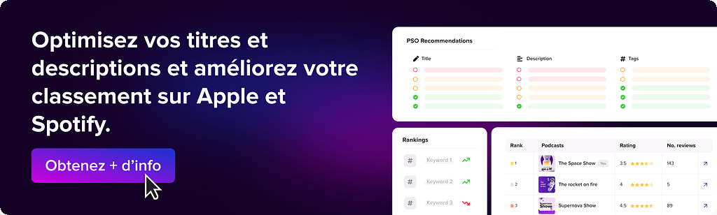 Ces données vous permettent d’ajuster votre ligne éditoriale et de mieux optimiser vos publications. En affinant vos titres, vos descriptions et vos mots-clés, vous augmentez vos chances d’être repéré dans les top podcasts sur Spotify ou dans les classements Apple Podcasts. C’est ainsi que vous pouvez progressivement vous hisser parmi les top podcasts 2024, voire rejoindre la liste des meilleurs nouveaux podcasts du moment.